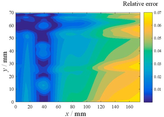 Furthermore, to analyse the agreement between the optimum solution and the optimisation objective, the relative error of the heat flux density on the inner wall surface of the specimen under the optimum solution with respect to the optimisation objective is shown in Figure 16. The relative error was larger at the position of the specimen inlet and outlet, but the maximum value was less than 8%, and the average relative error value of the heat flow density on the whole specimen surface was 4.9%. It can be seen that the conical combustion surface under the combustion test condition of the metal fibre surface can well simulate the heat flow distribution under the given condition. In addition, by establishing the kriging surrogate model for metal fibre combustion heating and adopting the non-dominated sorting genetic algorithm (NSGA-II) optimisation method with elite strategy, the test parameters corresponding to the given condition can be efficiently adjusted.