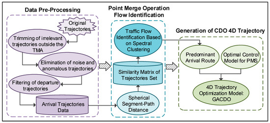 Figure 1. The process consists of five steps: (1) extract arrival trajectories from the traffic flow records within the boundaries of the terminal control area; (2) calculate the distances between pairs of trajectories sequentially to obtain the spherical symmetric segment distances, and construct the similarity matrix of the arrival trajectory set; (3) use a spectral clustering algorithm to obtain the spatial pattern of arrival traffic flow, identify the core trajectories for the identified traffic flow and, finally, take the horizontal profile of the core trajectory as the prevailing arrival route; (4) establish an optimal control model for a CDO profile with PMS topology based on predominant arrival routes; and (5) solve the optimal control problem for vertical profiles using a nonlinear trajectory optimization model—called GACDO—based on a genetic algorithm.