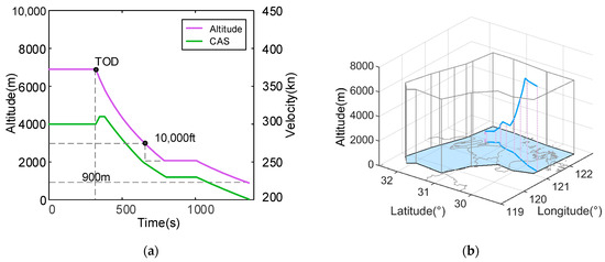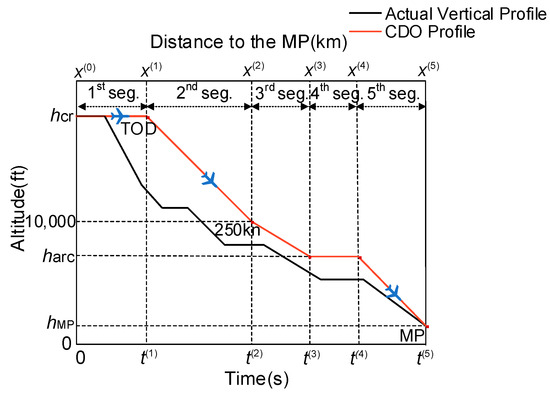 34]. Subsequently, Park et al. employed the Legendre–Gauss pseudo-spectral method to determine the optimal commencement of the descent point and descent profile, and proposed a CDO trajectory that simultaneously reduces flight time and minimizes fuel consumption [