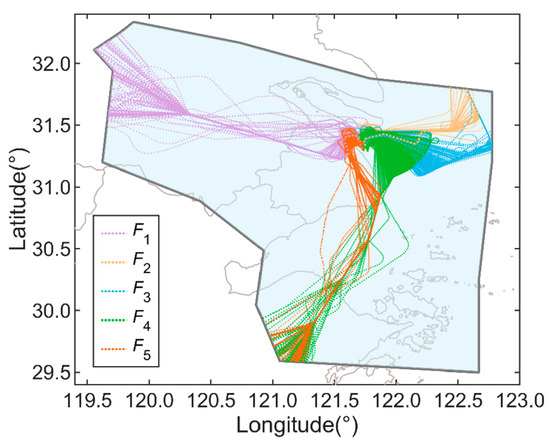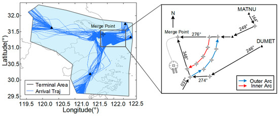 Finally, we obtain the arrival trajectories during a period of time. The set of trajectories formed by all arriving aircraft in the terminal area over a given time period is , where each denotes an arriving flight trajectory and N denotes the total number of all such trajectories.