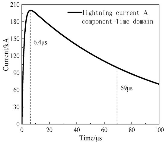 According to standard MIL-STD-464D [20], it is known that lightning current is a time-domain function, and the lightning current waveform is defined as a double exponential waveform. Thus, the expression can be written as