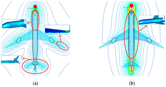 Figure 8 shows that there is a large electromagnetic field near the cockpit portholes, passenger cabin portholes, and hatches. That is, when lightning strikes an aircraft, with the conduction of lightning current on the fuselage, electromagnetic energy will enter the interior of the fuselage through the glass of the aircraft’s portholes as well as the gaps in the hatches, generating electromagnetic interference to on-board equipment, electrical cables, and systems. Therefore, in the subsequent study, it is necessary to consider the effects of lightning current on cables at different locations on the fuselage including portholes and hatches.