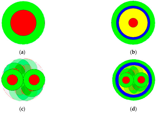 Different types of cables in aircraft: (a) a single wire; (b) a coaxial wire with a shielding layer; (c) a twisted pair; (d) a twisted pair with a shielding layer.