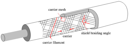 The majority of cables used in aircraft are metal braid shielding layers. The requirements of shielding coverage are not less than 85%, and the braiding angle is less than 50°. Therefore, we set the shielding layer of the relevant parameters as shown in Figure 11, in which the shielding layer is the metal braid. The carrier strand diameter is 0.1 mm, the number of strands per carrier is 5, and the shielding coverage is 87.49%.