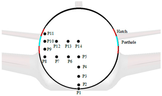 During the selection of the cable shielding layer inside the fuselage, one must consider the importance of the equipment, the type of transmission signal, the cable installation location, and working environment. The layout of the cables in the composite fuselage was analyzed to study its influence on shielding performance. Fourteen single wires were laid at different positions inside the composite aircraft fuselage, marked as P1-P14. The cables were parallel to the aircraft floor, with a longitudinal length of 9 m along the fuselage. The y-z section layout is shown in Figure 14.