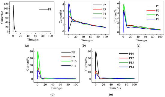 Induced current of cables at different positions: (a) P1 induction current; (b) P2–P5 induction current; (c) P5–P8 induction current; (d) P8–P11 induction current; and (e) P10–P14 induction current.