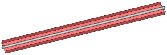Using CST studio suite 2020 simulation software, a cable is constructed inside the aircraft that is connected to the external skin, as shown in Figure 6, which is equivalent to the internal electrical cable of the aircraft and is used to observe and simulate the effect of the external lightning current passing through the fuselage on the internal cable. The metal mesh laid on the external skin is set in the material definition of CST simulation software for the relevant data of conductivity, thickness, and laying density, and the metal mesh is set in the corresponding area.