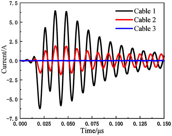 The shielding performance of the cables in the figure is from weak to strong, namely, cable 1, cable 2, and cable 3. Simulation verification was carried out using Figure 18d as an example to obtain the induced currents of the cables laid at different locations, as shown in Figure 19.