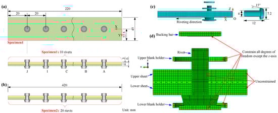 Figure 1a shows the layout and dimensions of Specimen 1, which contains 10 rivets. The total length of the specimen is 220 mm, with each rivet spaced 20 mm apart. The height and width of the specimen are 22.5 mm and 4.5 mm, respectively. Figure 1b shows the layout and dimensions of Specimen 2, which contains 20 rivets. The total length of the specimen is 420 mm, maintaining the same height and width as Specimen 1. Figure 1c also shows the dimensions of a single rivet, with a diameter of 12 mm and a length of 7.2 mm. Figure 1d presents a detailed diagram of a close-up view of the riveting process. The upper and lower sheets are held by blank holders, and the bucking bar supports the sheets from the opposite side of the riveting direction, the relevant material properties are presented in Table 1. Constraints are applied to all degrees of freedom except the Z-axis to accurately simulate the riveting process.