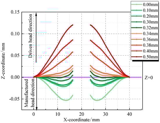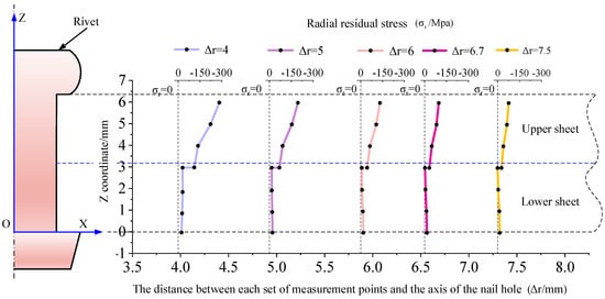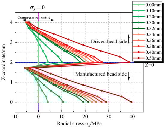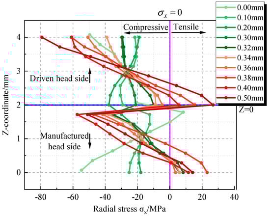 The forced displacements of the burking bar prior to riveting (pre-applied upward force ) were set at 0.1 mm, 0.2 mm, 0.3 mm, 0.32 mm, 0.34 mm, 0.36 mm, 0.38 mm, 0.4 mm, and 0.5 mm, with a finite element model without forced displacement serving as a control group for the numerical simulation calculations. The X and Z coordinates post-riveting were extracted from path 3, as shown in Figure 20. The Z coordinates and radial stresses post-application of pre-stress (before riveting) were extracted from path 4, as displayed in Figure 21. Similarly, the Z coordinates and radial stresses post-riveting were extracted from path 4, as presented in Figure 22.