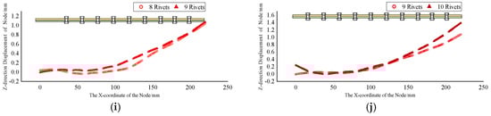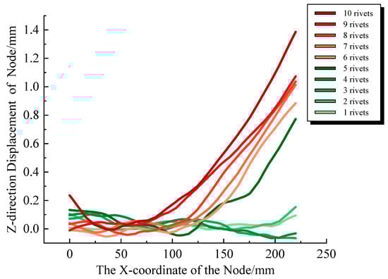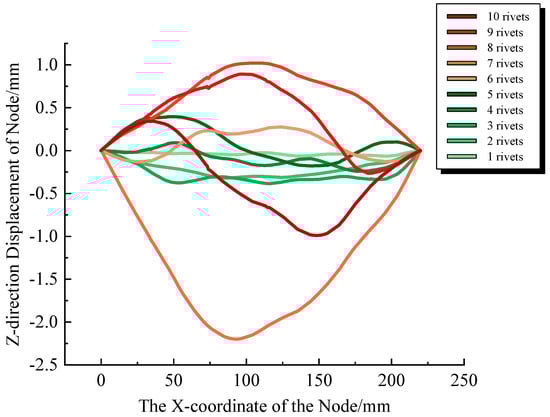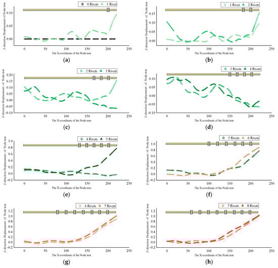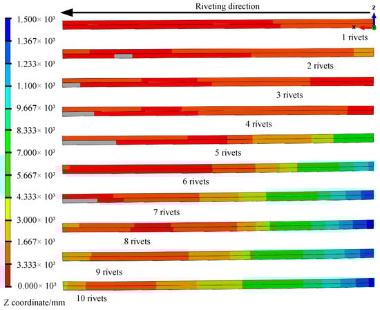 Finite element calculations were performed, and the deformations of the specimen post-riveting of each rivet were extracted, as shown in Figure 9, to observe the cumulative deformation patterns following each rivet connection. Furthermore, for a comparative analysis, all data are consolidated in Figure 10.