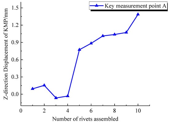 Figure 4 illustrates the central axial path (Path 1) and the key measurement point A within the 10-rivet specimen, both of which effectively reflect the overall deformation distribution and maximum deformation post-riveting. After each riveting, the X coordinates and Z-direction displacements of the nodes along Path 1 were extracted. These are plotted in Figure 5 using the end position of the riveting sequence as the reference baseline for deformation calculations. All deformation profiles are integrated and displayed in Figure 6. Additionally, the Z-direction displacements at measurement point A, post-riveting of each rivet, are shown in Figure 7.