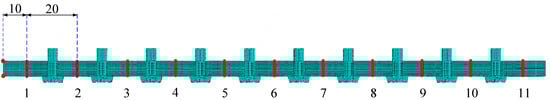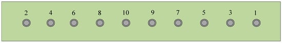 According to [13], the riveting sequence alters the constraint conditions of the specimen during the riveting process, thereby affecting the final deformation appearance. Proper planning of the riveting sequence can reduce the deformation of the specimen to some extent. This study continues using Specimen 1 with ten rivets, analyzing the cumulative process of deformation under changing order riveting. Figure 8 shows a schematic of the riveting sequence using the changing order method for ten rivets.