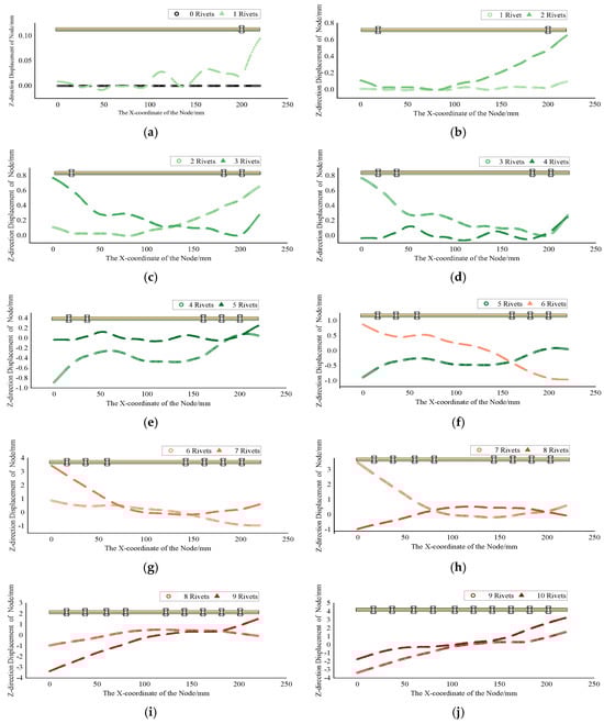 Riveting deformation accumulation. (a) Central axis displacement of the specimen before riveting 1 rivet. (b) The displacement of the central axis after riveting 1 rivet and 2 rivets. (c) Central axis displacement after riveting 2 rivets and 3 rivets. (d) Central axis displacement after riveting 3 rivets and 4 rivets. (e) Central axis displacement after riveting 4 rivets and 5 rivets. (f) Central axis displacement after riveting 5 rivets and 6 rivets. (g) Central axis displacement after riveting 6 rivets and 7 rivets. (h) Central axis displacement after riveting 7 rivets and 8 rivets. (i) Central axis displacement after riveting 8 rivets and 9 rivets. (j) Central axis displacement after riveting 9 rivets and 10 rivets.