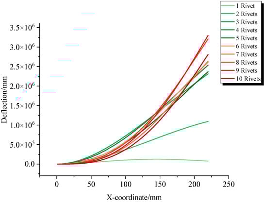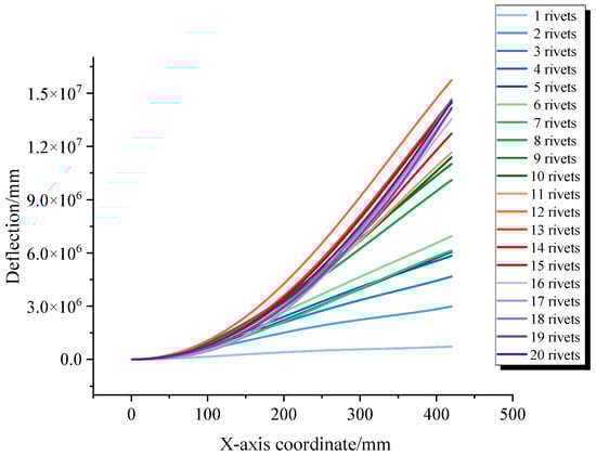 The equivalent bending moment–deflection correlation model, which utilizes radial residual stresses extracted from a multi-rivet sequential relay calculation model as input, determines the specimen’s deflection deformation, as illustrated in Figure 17. Comparing this with Figure 6, it is evident that the trends of analytical and numerical calculation results are consistent. As the number of completed rivets increases, the bending deformation of the specimen becomes more pronounced, with significant accumulative deformation displacement occurring at one end of the specimen. Therefore, it can be asserted that the equivalent bending moment–deflection correlation model effectively describes the relationship between the radial stress field and deformation of the specimen.