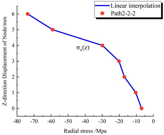 To further analyze the correlation between residual stress and deformation displacement, using the finite element analysis results of Specimen 1 as an example, eleven radial stress extraction paths were selected along the longitudinal cross-section at the midpoint between adjacent rivets, spaced 20 mm apart, as shown by the red lines in Figure 12. For Specimen 1, after the completion of ten rivets, the Z coordinates and radial stresses of nodes on these paths were extracted, totaling 110 sets of data, each set containing seven data points. Figure 13 displays the radial residual stress of seven nodes along the second path (hereinafter, referred to as Path2-2-2) after completing two rivets, and the corresponding Z coordinates. To provide a detailed representation of the radial residual stress distribution along the axial direction (Z-direction) of the rivet holes, a linear interpolation method was employed to construct a radial residual stress prediction function, depicted as the blue curve in Figure 13.