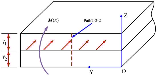 Figure 14 displays a Z-Y cross-sectional view of the specimen that includes path 2-2-2, where the thicknesses of the upper and lower sheets are t1 and t2, respectively. Given that the specimen’s bending deformation around the Y-axis is substantially greater than around the X-axis, it is assumed that the radial residual stresses are uniformly distributed along the Y-axis within any Z-Y cross-section, as shown by the red lines in Figure 14. Based on this assumption, the bending moment My around the Y-axis of this cross-section can be calculated using the relevant formulas, where t represents the total thickness of the specimen.