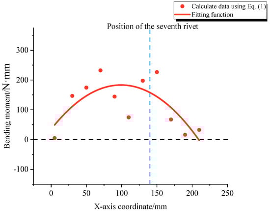 Figure 15 illustrates the bending moment distribution for a ten-rivet specimen after riveting seven rivets, where the red dots represent the bending moments calculated according to Equation (1), totaling eleven points. From Figure 15, it can be observed that the equivalent bending moments are larger in the middle and smaller at the ends, indicating a distribution trend that decreases from the center towards both sides.