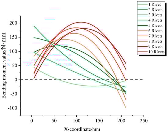 Utilizing a consistent fitting method, the equivalent bending moment distribution for the specimen can be obtained after the riveting process is completed, as shown in Figure 16. It is observed that the riveting process induces a positive bending moment within the specimen’s cross-section. As the number of completed rivets increases, the position of the maximum equivalent bending moment progressively shifts to the right.