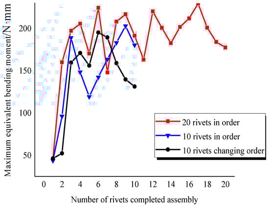 According to Equation (3), an increase in the equivalent bending moment of a specimen correlates with a higher non-uniformity in its internal radial residual stress distribution, thereby leading to more pronounced bending deformations. Maximum equivalent bending moments were extracted after the installation of each rivet for specimens with 10 sequential rivets, 10 rivets using the edge method, and 20 sequential rivets, as depicted in Figure 18. The observations indicate that the maximum equivalent bending moments significantly rise after the installation of the initial rivets. In sequential riveting, the maximum bending moment fluctuates around a high value (200 N·mm), while in changing order method riveting, it continuously decreases towards the last few rivets. Correspondingly, the deformation accumulation increment is relatively small for the initial few rivets in sequential riveting but increases significantly for subsequent rivets (as shown in Figure 6 and Figure 11); conversely, in varied sequence riveting, a reduction in deformation is observed in the last few rivets (as shown in Figure 10).