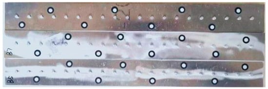 Experiments and validation efforts were carried out for the sequential riveting of 20 rivets. The riveting test environment is shown in Figure 23, where an adapted electronic universal testing machine was used to apply loads to the rivets and a support stand was employed to maintain the specimen in a horizontal position during the riveting process. Figure 24 displays multi-rivet specimens upon completion of riveting.