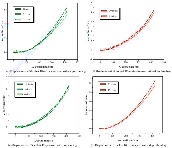Figure 25a,c indicate that specimens from both experimental groups exhibited initial deformation before riveting, with maximum displacements of 5.28 mm and 5.99 mm at zero rivets, showing a minor difference. After riveting 5 and 10 rivets, both groups of specimens exhibited cumulative bending deformations. The control group displayed displacement increments of 0.58 mm and 0.55 mm after riveting 5 and 10 rivets, respectively. In contrast, the deformation suppression group exhibited increments of 0.44 mm and 0.13 mm. Upon comparison, the deformation suppression group showed reductions in maximum displacement increments of 0.14 mm and 0.42 mm after riveting 5 and 10 rivets, respectively.