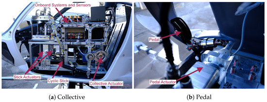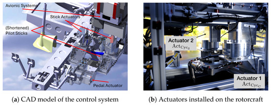 In all of the projects mentioned above, the actuators are deeply integrated in the rotorcraft mechanical control system. The rotorcraft are either designed as unmanned systems from the beginning or the manned–unmanned conversion is a long process and not easily reversible. The idea of retrofitting a robotic flight control system with integrated avionics has been investigated before. In the ROBOPilot project [15], such a system was designed for and tested on a Cessna 172 aircraft. The system successfully demonstrated automatic flight. In another study, a robotic actuator system was mounted into an SVH-4 rotorcraft and was tested in a hovering platform [16]. No free flight of the helicopter was reported in this project. The control mechanism in the cockpit consisted of a multi-arm robot and additional mechanisms for controlling the pedals and the collective lever. This concept is similar to an Aurora Flight Sciences study [17], in which a multi-arm multi-purpose robot was retrofitted into a Cessna Caravan copilot seat and could successfully fly the aircraft.