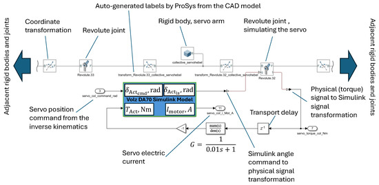 Simscape allows for each joint available in the multi-body model to be actuated. This function was used to actuate the mechanism using the joints that represent the connection of an arm to a servo. If the rotational motion is commanded at a rotational joint, the required torque to realize the commanded motion can be measured at the same joint. This interface was also utilized to couple the Simscape multi-body model with physics-based models of the actuators in Simulink. Figure 3 shows the coupling of the servo Simulink model with the revolute joint, modeling the connection of the collective servo arm with the servo shaft, as an example. As seen in Figure 3, the servo position commands generated by the inverse-kinematics software are fed to the actuator model. The “is” position of the actuator ( in Figure 3) is used to simulate the motion of the joint. The moment at the joint due to this motion is measured and fed back to the actuator with a transport delay to avoid an algebraic loop. The hinge moment is computed by the multi-body simulation mainly based on the aerodynamic forces and moments, which are modeled as torsion spring and damping coefficients at the pilot inceptors. The Simscape multi-body simulation propagates these moments through the nonlinear kinematics of the system to compute the moments at the servo shaft. In addition to the aerodynamic moments, the inertia of the system parts also contribute to the total moment at the servos, due to their acceleration. The actuator Simulink models consist of its subsystems models, i.e., the electric DC motors (developed as described in Ref. [22]), the gearbox, the proportional–differential motor controller, and the electronics. The actuator models were parametrized based on the initial selection of the components during the design process. The multi-body simulation model, coupled with the actuators, conclude the simulation model for the forward kinematics of the robot.