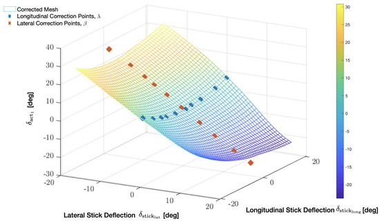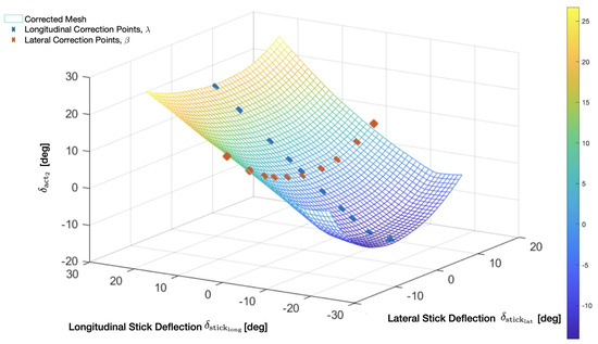The stick LuTs were determined by simulating the inverse-kinematics multi-body simulation for a 45 × 45 uniform grid of the cyclic stick in equidistant longitudinal and lateral positions. The corresponding positions of the servos (actuator 1) and (actuator 2) were recorded during 2025 simulation runs of the multi-body simulation model at the 45 × 45 cyclic stick positions. Limited adjustment of the LuTs based on measurements on the real system were necessary due to the manufacturing tolerances and further inaccuracies in the assembly of the robot in the helicopter. The servo internal position measurements using a hall sensor and the angles of the control stick, measured by inclinometers, were used for the calibration of the LuTs. The selected longitudinal and lateral calibration points, as well as the full inverse-kinematics LuTs, are visualized in Figure 5 and Figure 6. The correction points were chosen arbitrarily along the lateral and longitudinal stick deflection directions, while attempting to achieve a uniform distribution of points in both directions.