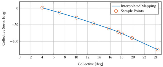 The one-dimensional LuTs for the pedal and collective lever were developed only based on the direct measurements on the system, as enough points in the motion space could be measured in the one-dimensional case. Figure 7 and Figure 8 show the mapping between the collective and pedal positions and their respective actuators. Nonlinearities are evident in all of the one- and two-dimensional mappings.