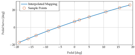 A linear interpolation scheme was applied to the points of the 45 × 45 grid for each actuator (), denoted by , which can be evaluated at any stick position query point to determine the output shaft position of each of the actuators () required to achieve a desired stick position. The grid for each actuator consists of the vectors of the longitudinal and lateral stick positions at which the virtual measurements took place ( and ), and the corresponding position of the servo output shaft :