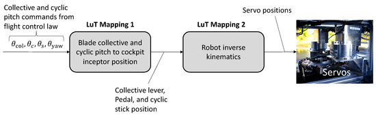 The structure of the robot control software is provided in Figure 9. The collective and cyclic commands, computed by the flight control law are converted to cockpit inceptor positions by a first set of linear one-dimensional LuTs. The LuTs of Figure 5, Figure 6, Figure 7 and Figure 8 are applied to the cockpit inceptor positions to compute the corresponding servo positions. The kinematics of the control system, specifically in case of the stick with two actuators, was successfully canceled via the approach described here, such that the lateral or longitudinal commands from the flight controller were executed as such on the pilot stick without any cross-axis coupling.