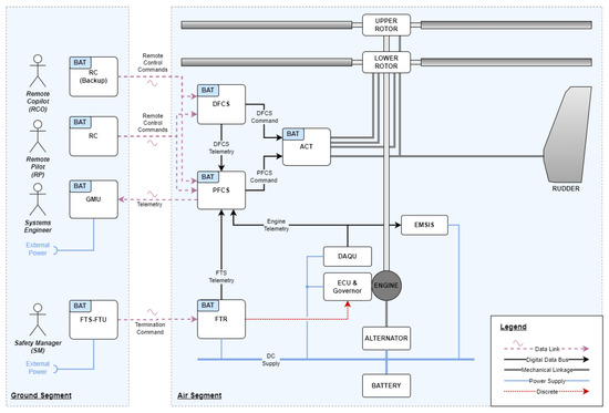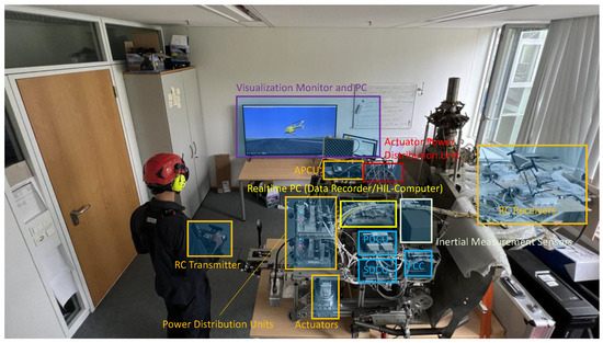 The detailed electronic architecture is shown in Figure 11. The remote-control functions are executed on two control units: The flight control computer (FCC) provides closed-loop attitude and angular rate control. The inertial measurements for these control functions are captured by an air data attitude heading reference (ADAHRS) unit. It should be noted that no air data measurements are used for closed-loop control. The backup direct mode control is executed by the so-called “Pilot-DCU” (PDCU). Each control unit receives command signals from the RC through multiple receiver units (called PRX in Figure 11). The receiver units are placed on different locations outside the helicopter fuselage to ensure stable reception on multiple units in any orientation of the helicopter. A cross-talk interface between the PDCU and FCC additionally forwards the control commands received by the PDCU to the FCC such that the augmented control through the FCC remains available even if reception is lost on all of the directly connected receiver units.