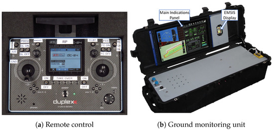A ground monitoring unit (cf. Figure 12b) provides real-time indication of flight critical system parameters such as the voltage levels of the FCS batteries and the signal strength of the different data links on a main indications panel. This panel also includes an indication of the position of the UAV over a synthetic map view, together with the boundaries of the operating volume. The engine warning LEDs that are installed in the manned version of the helicopter are replicated by software lamps. The panel also includes synoptics sections showing the current operating mode of the flight control system, which are used mainly to provide feedback to the remote pilot during operations and for troubleshooting. Engine parameters and the current fuel level are indicated on a separate display unit (EMSIS), which is identical to the indication unit normally installed in the cockpit of the manned version of the helicopter. Therefore, all indications and warnings according to the aircraft flight manual of the manned variant are also provided in the unmanned version.