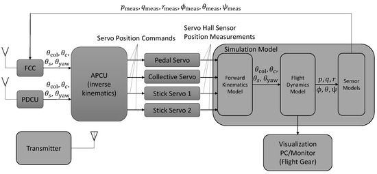 The robotic actuator system was developed in CATIA, and a multi-body model of the robotic actuator system, consisting of multiple actuators and nonlinear kinematics, was developed in Simulink, using the Simscape toolbox. The CATIA–MATLAB interface of Ref. [21] was used for this purpose. The multi-body simulation model was coupled with physics-based models of the actuators. The simulation model was utilized to develop an onboard robot control software to cancel the nonlinear kinematics of the control mechanism. The onboard robot control software needed to be simple, robust, and avoid complex or non-determinstic simulation software (such as multi-body simulations). Furthermore, linear low-order systems of the actuators were also estimated from the test data captured during flights on a hover frame. A system architecture consisting of aerospace-grade components was developed, which facilitates the unmanned operation of the rotorcraft in compliance with the relevant aviation regulations. It also enabled recording the flight parameters from a wide array of sensors installed on the rotorcraft.