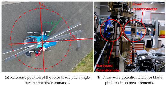 The pedal and the collective lever are also each controlled by a servo, as depicted in Figure 2a,b. The nonlinear control kinematics in this case is also canceled with inverse-kinematics LuTs embedded into the robot control software. However, the LuTs are one-dimensional for the collective lever and the pedal and can be easily determined based on a multi-body simulation model and corrected using measurements on the real system.