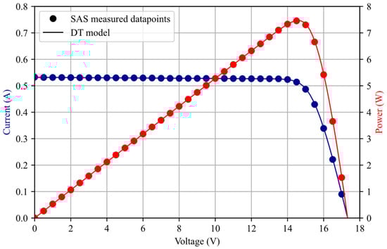 For the DT development, the SASs were modeled using the single-diode model (SDM) electrical circuit. The parameters of the model were calculated from the extracted experimental curves using the two-step linear least-squares (TSLLS) method, as presented in []. Figure 2 illustrates the measured current–voltage and power–voltage characteristics of one SA Section, as well as the curves extracted from the DT model. Table 1 presents the parameters of the SDM model used in the DT.