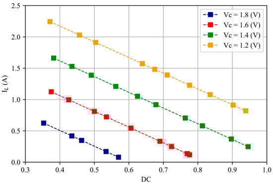 Additionally, the nonlinearity induced by the LT3485 anti-slope compensation circuit was considered. Experimental measurements were used to model the duty cycle of the converter as a function of the output current and the control voltage (VC). Figure 4 shows the experimental inductor current as a function of the control voltage and the duty cycle, and Equation (5) presents the formula used to model the anti-slope compensation.