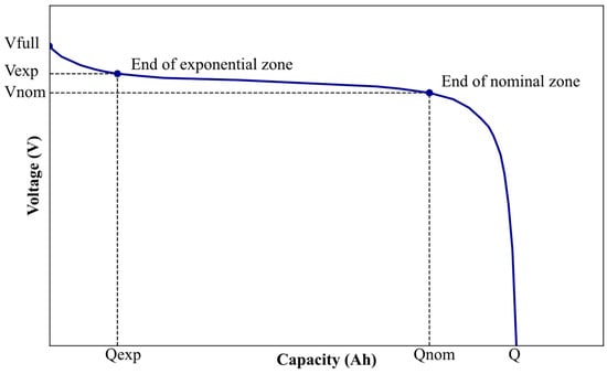 The battery consists of four 2600 mAh Samsung Li-Ion 18650 cells arranged in a 2S2P configuration. The steady-state general battery model described in [] was utilized; this model comprises a nonlinear voltage source (E) with a series resistance (Rbat). A notable feature of this battery model is that its parameters can be easily deduced from experimental discharge curves. By utilizing an experimental discharge curve and the model’s equations, curve fitting can be applied to determine the parameters of the model. Figure 6 highlights the key points on a discharge curve for the determination of the model parameters.