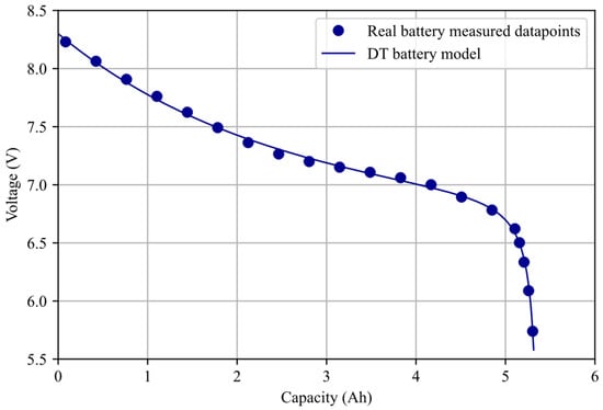 Figure 7 illustrates the experimental measured battery discharge curve as well as the curve from the DT model. Table 2 presents the battery model parameters obtained by fitting the values to the measured discharge curve and the previous equations. These values were used for the implementation of the DT.
