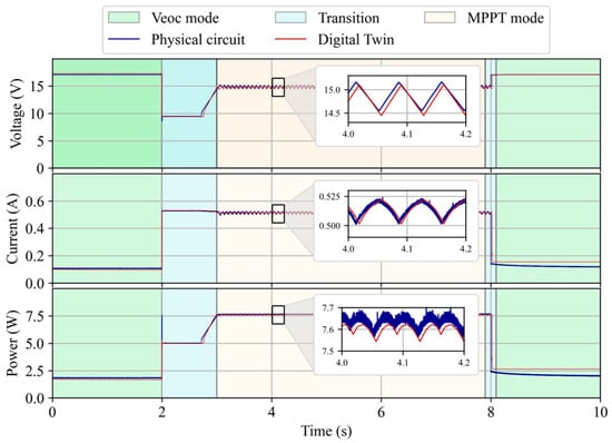 To implement the DT in the real-time simulator, the circuit models described in the second section were used. Additionally, appropriate tests were selected to validate the DT. One such test is illustrated in Figure 9, which presents a comparison of the SAR operation across three possible scenarios: MPPT mode, VEOC mode, and the transition between the two modes.