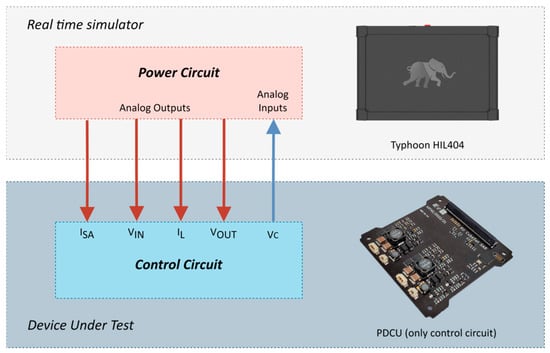 CHIL diagram. The red arrows refer to the analog outputs of the real-time simulator, and the blue arrow to the analog input.