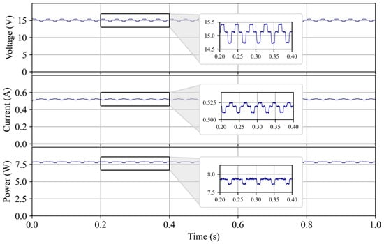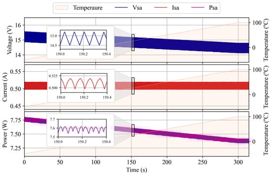 Figure 13 displays the results of this test, showcasing the voltage, current, and power of the SAS. The results indicate that the SAS operating point oscillates around the MPP, which is approximately 15 V.