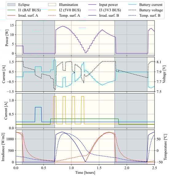 To illustrate an application, the irradiance and temperature profiles of the CubeSat solar cells were computed with the 2024 version of Radian System Software [] for a low Earth orbit (LEO) at an altitude of 793 km and Earth-pointing nadir orientation. These parameters are used in the DT to update the SAS model, enabling the real-time simulation of the EPS throughout a complete orbital cycle. Figure 14 presents the most significant waveforms obtained from this simulation, highlighting the dynamic performance and interactions of the EPS components. The upper graph displays the SAR input power; the second graph illustrates the current and voltage of the battery; in the third graph, the currents through the different loads are plotted; and the lower graph shows the irradiance and temperature of both solar array surfaces. At the start of the illumination period, the battery is not fully charged, so the system operates in MPPT mode. Later, towards the end of the illumination phase, the input power decreases as the battery becomes fully charged, and the two SAR phases of surface A begin to operate in VEOC mode. During the eclipse periods, there is no power at the system inputs, causing the battery to start discharging.