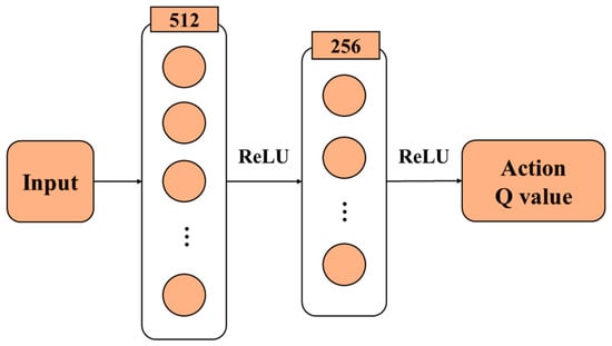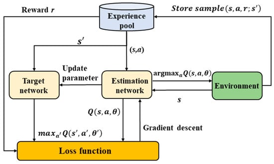 The deep Q-network combines the advantages of deep learning and traditional reinforcement learning algorithms in Q-learning. Based on the MDP theoretical framework, the optimal policy can be derived through Q-values []. The traditional Q learning algorithm uses the Q table to store the reward obtained by taking a certain action in each state, which is the state-value function. However, when the environment is too complex and there is too much data, the Q table is not only difficult to store but also difficult to search, which is prone to problems such as dimension explosion []. To solve the above problems, the deep neural network is used as a function approximation instead of the Q-value table, and the value function is calculated. However, simply using neural network superposition in Q-learning will cause instability and even non-convergence. To this end, the deep Q-network is optimized, and the experience pool and dual network structure are used to stabilize the training process.