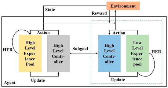 Hierarchical reinforcement learning can solve the original problem by dividing the complex problem into several small problems and solving the small problems separately. Hierarchical reinforcement learning can effectively solve the dimension explosion problem of reinforcement learning by studying how to abstract complexity into different levels and using hierarchical structure to learn strategies at different levels to better solve the problem [,]. Its essence is to decompose the task into sub-tasks at different levels of abstraction; the low level provides the optimal strategy for completing the sub-tasks, and the upper level provides the appropriate sub-tasks for the low level to obtain the optimal strategy for solving the overall task. At the same time, the hierarchical deep reinforcement learning method further solves the sparse reward problem by reducing the action sequence space of each layer strategy.