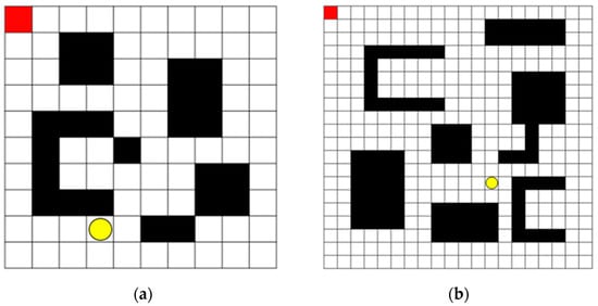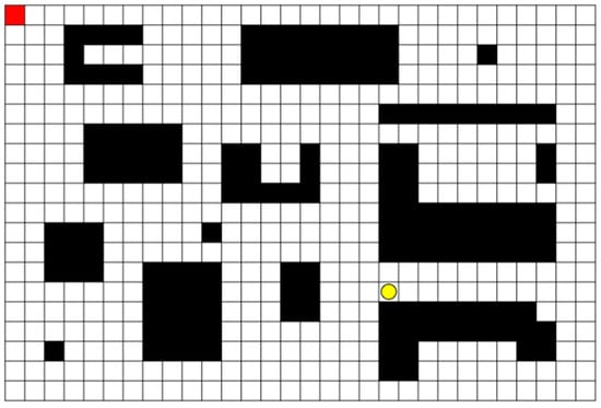 20 × 30 grid map. The red square marks the agent’s starting position, the yellow circle denotes the randomly generated target for each iteration, and the black grids are fixed obstacles throughout training.