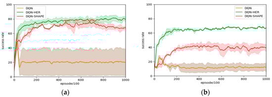 However, reward shaping is limited and often benefits from a well-designed reward function, which requires a large amount of prior knowledge in the corresponding field and has poor generalization. For obstacle avoidance tasks, the commonly used Euclidean distance will mislead the agent, and it is difficult for the agent to deal with complex environments such as dead corners and corridors [,], which makes it difficult for the algorithm to be applied to environments with high requirements for dynamic confrontation and real-time decision-making. Different from reward shaping, the hindsight experience replay [] mechanism adds the input information of the goal and generates the successful sample by correcting the goal of the failed sample generated in the learning process so that the agent can obtain the positive reward faster, greatly improving the algorithm training efficiency. Moreover, it reduces susceptibility to the complexity of obstacle-laden environments and proves adaptable to scenarios involving multi-goal learning.