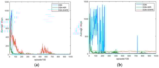According to the data in Figure 9, the DQN-HER algorithm requires significantly fewer steps to reach the target compared to the DQN and DQN-SHAPE algorithms. This indicates that the DQN-HER algorithm not only has a higher navigation success rate but also finds shorter and more efficient paths, demonstrating higher efficiency in navigation.