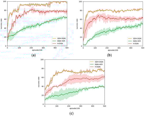 The training curve results in Figure 8, Figure 9, Figure 10 and Figure 11 show that GDH-DQN achieves higher success rates with fewer training steps compared to H-DQN and DQN-HER. This demonstrates the algorithm’s fast learning speed and quick convergence, as well as its ability to save computational resources.